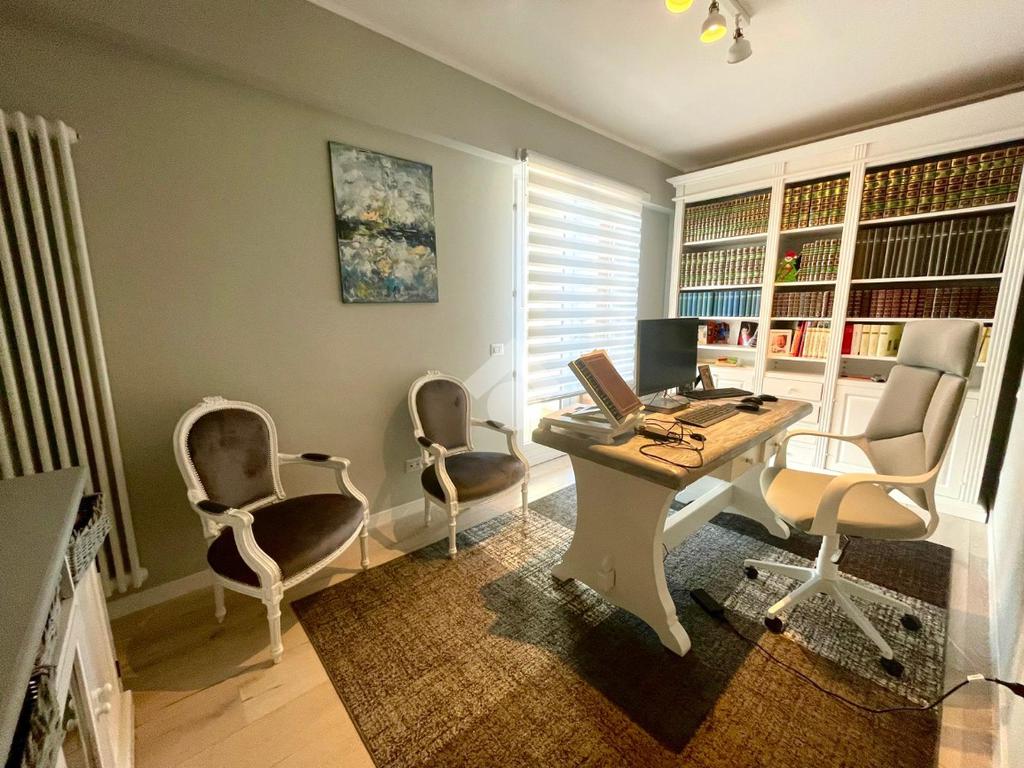 Al piano inferiore, la zona notte comprende tre camere da letto matrimoniali di cui una con cabina armadio, un ampio studio e due bagni.